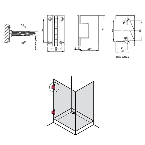 - Bản lề tường kính 90 hafele 981.77.900 phù hợp cho cửa mở trái và mở phải