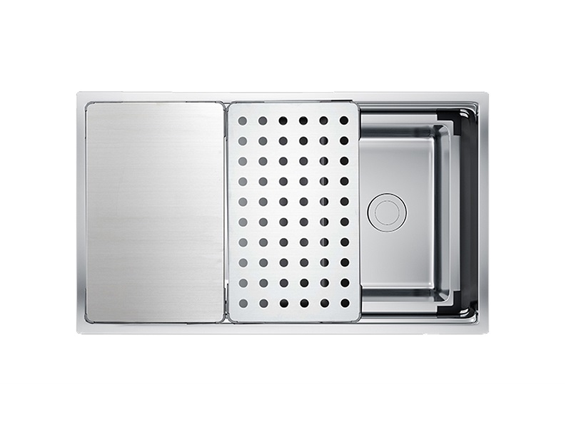 - Thiết kế hiện đại với gờ hạ bậc – tích hợp phụ kiện thông minh: Siphon, giá úp bát inox, chậu rửa nhỏ, thớt inox, thớt inox lỗ