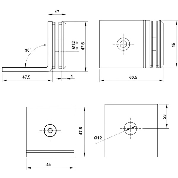 Thông tin sản phẩm kẹp kính – tường 90º có đế màu đen Hafele 981.77.911