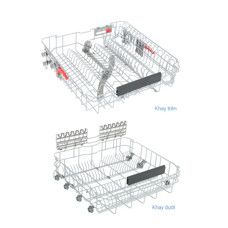 - Khay trên và khay dưới: Có thể điều chỉnh độ cao giữa 2 khay dễ dàng, hỗ trợ bạn sắp xếp chén bát có nhiều kích cỡ khác nhau được thuận tiện. Ngoài ra, phần giá đỡ bên trái của khay trên còn có thể gập linh hoạt và cho phép bạn điều chỉnh theo 3 mức cài đặt bằng cần gạt phía trong, nhờ đó linh hoạt sắp xếp các vật dụng ngăn nắp hơn.